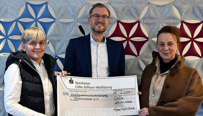 Der Lions Club Celle hat dem Celler Verein Brennessel, der sich für den Schutz von Kindern und Jugendlichen vor sexualisierter Gewalt einsetzt, eine Spende in Höhe von 2250 Euro überreicht, die beim jährlichen „Waffelbacken auf dem Celler Weihnachtsmarkt“ zusammenkam. „Die kontinuierliche Arbeit von Brennessel ist für unsere Stadt von großer Bedeutung. Deshalb ist es uns wichtig, dieses Engagement seit vielen Jahren zu begleiten und zu fördern“, sagte Club-Präsident Werner Heyer. Den symbolischen Scheck nahmen die Vereinsvorstände Irina Adolph (links) und Marliese Gierveld-Törkel entgegen. (ths) Foto: Thomas Buhr